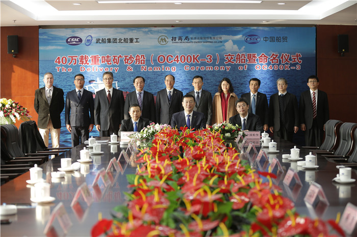 11月23日,武船集團(tuán)北船重工為招商局能源運(yùn)輸股份有限公司建造的第三艘新型40萬噸礦砂船“明業(yè)”輪命名交付并拔錨遠(yuǎn)航。這是武船集團(tuán)40萬噸礦砂船系列產(chǎn)品中交付的第5艘船。香港明華船務(wù)有限公司總經(jīng)理丁磊,中船重工國際貿(mào)易有限公司船舶貿(mào)易部部長孫勇,武船集團(tuán)黨委委員、北船重工董事長韓兵作為三方代表共同簽署了交接船議定書。