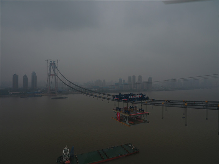 11月15日,由武船集團(tuán)制造的國(guó)內(nèi)首座跨長(zhǎng)江雙層公路懸索橋――武漢楊泗港長(zhǎng)江大橋首個(gè)鋼桁梁節(jié)段吊裝成功。