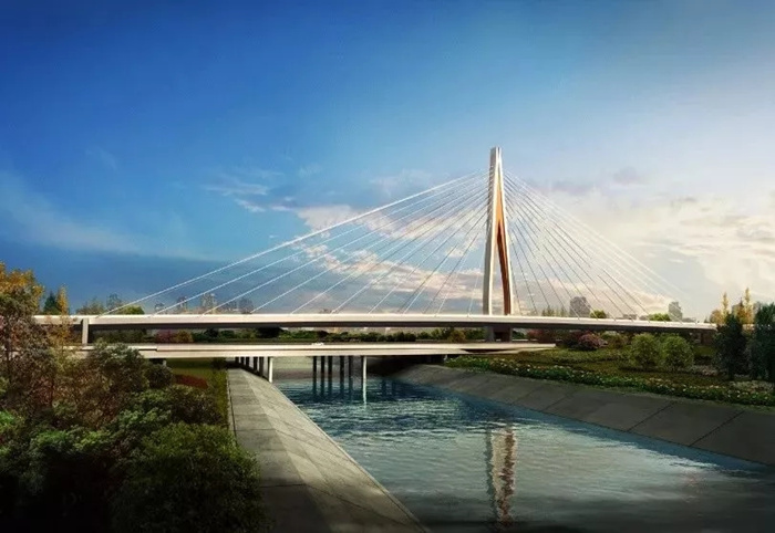 該項目位于鄭州市四環(huán)線西部(大河路-南四環(huán)),規(guī)劃為快速路,全長21.6km,高架橋為雙向八車道。項目南起西四環(huán)光明路口向南300m,北至西四環(huán)晨星路口向北160m,全長5.95km。橋梁總長300m,橋面總寬49.16m,主橋?qū)侏毸p索面斜拉橋,采用梁高3.5m鋼箱梁結(jié)構(gòu)形式。
